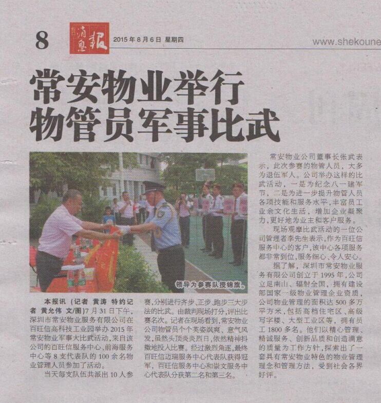 在2015年八一建軍節(jié)即將來臨之際,公司上下歡聚在百旺信高科技工業(yè)園,舉辦軍事隊列比武,一方面慶祝中國人民解放軍建軍88周年,另一方面向大家宣傳強身健體的觀念,同時向各位業(yè)主展示公司秩序維護隊伍的專業(yè)性和可靠性。每個服務(wù)中心代表隊都意氣風發(fā)、斗志昂揚,充分展示了自己的實力,收獲了屬于自己的榮譽。