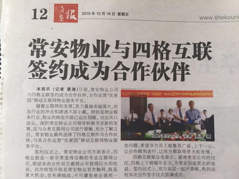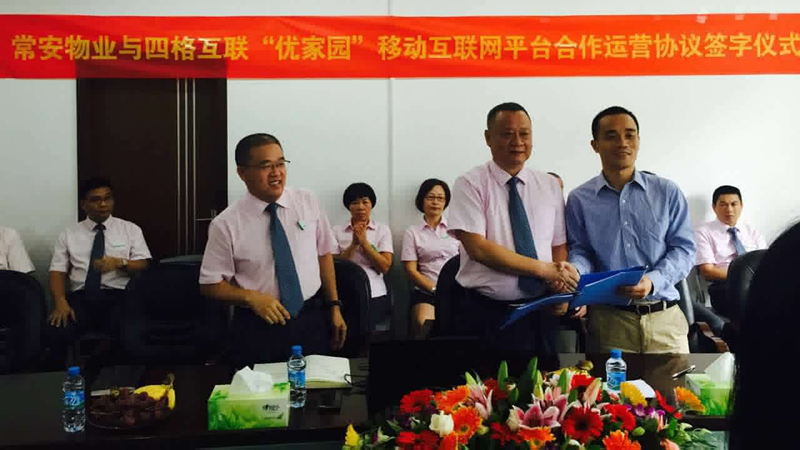 2015年10月10日上午于公司會議室與四格互聯(lián)進(jìn)行了合作簽字儀式。儀式上,張武董事長表示,四格互聯(lián)是一家非常值得信賴的專業(yè)互聯(lián)網(wǎng)公司,本次合作雙方都將從合作中獲得巨大的收益。公司由于是首次進(jìn)行此類轉(zhuǎn)型,將不可避免地遇到各種困難,希望雙方員工能集思廣益、上下一心,讓合作順利進(jìn)行,讓雙方都取得更大的發(fā)展。四格互聯(lián)的梁總表示,感謝常安公司的信任,物業(yè)方面常安是專家,希望得到常安更多的指導(dǎo),四格上下將竭盡全力,為常安創(chuàng)造更大的效益。張總和梁總簽字之后一起開香檳,熱烈慶祝本次合作簽字儀式的圓滿成功。